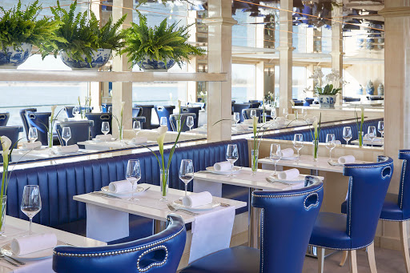 The ship’s redesigned lounge features sofas and chairs with hand-made upholstery, a parquet floor and upholstered ceiling panels, solar shades, and new USB ports allowing guests to charge anywhere they are sitting. The artwork throughout the ship includes pieces from Pablo Picasso, Alexander Calder, and Pino Signoretto.